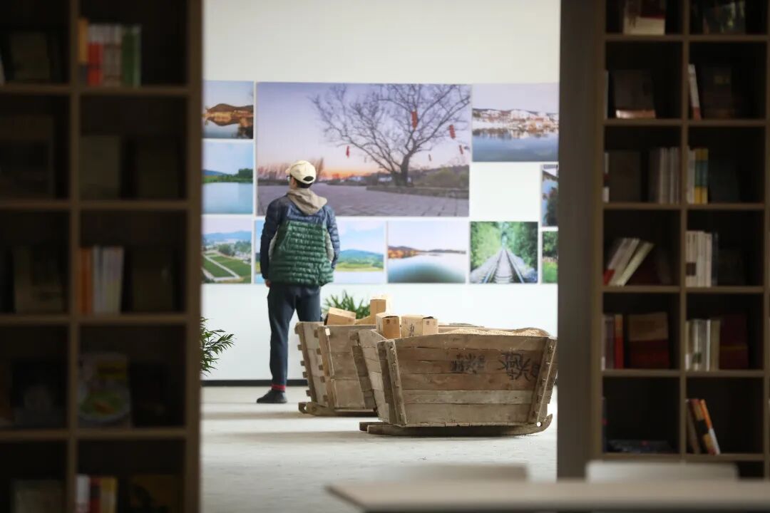 原木书架整齐排列